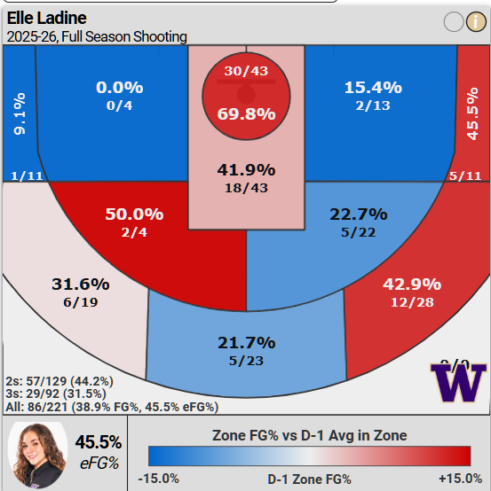 Elle Ladine gives UW a versatile, attacking wing who can score from the mid-range or beyond the arc, while defending multiple spots, and providing secondary playmaking and rebounding.