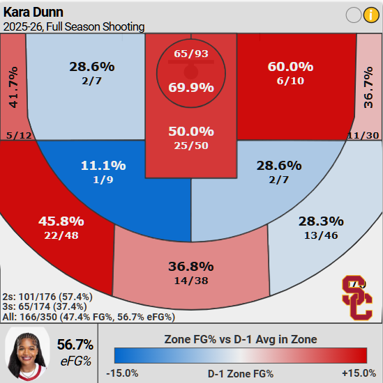 Next to Davidson is 5’11” senior guard Kara Dunn, the Trojans second-leading scorer at 15.6 points per game; as well as team-leading three-point shooter at 37.4%; while also converting 57.4% of her two-point attempts. Dunn’s ability to provide high‑efficiency scoring when defenses overcommit to Davidson is crucial to the Trojans’ success..