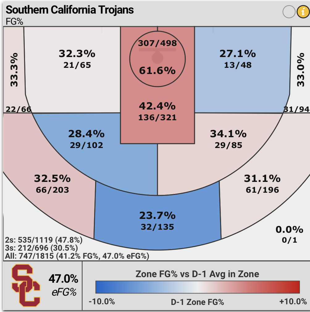 The Trojans are most efficient scoring at the rim (within 4.5 feet) making 61.6% of their shots; while making 42.4% from farther away in the lane.