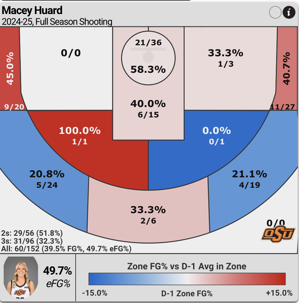 In her 2024-25 season at Oklahoma State, Macey Huard averaged 6.4 Points on 32.3% shooting from three-point range; 3.5 Rebounds; and 0.5 Blocks per game.